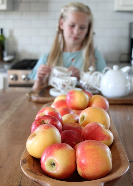 I always include a little treat with our tea. Since the girls obviously already have quite the sugar intake (the sugar cubes are just too tempting - ha), I try to balance it with a "healthier" treat. This apple snacking cake actually doesn't have any flour in it, but uses almond butter, which gives us some protein and healthy fats to help us last the afternoon. I'll share the recipe below! This is a delicious tea cake, just lightly sweet and very filling. I like to add in chunks of fresh apple and some pecans. We have been known to have scones with our tea, but for the most part, I usually try to have something that I feel is a little better for us.