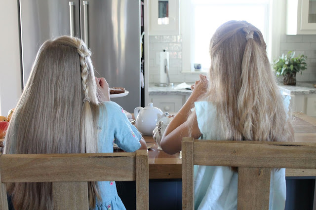 The girls actually refer to our teatime as a "tea party", but as you can see our teas are very informal, and yet feel special with pretty dishes and time carved out. We often sit at the dining table, but sometimes the kitchen island is a pretty perfect place to land. We've even been known to read some poetry at our teatimes on occasion. ;-)